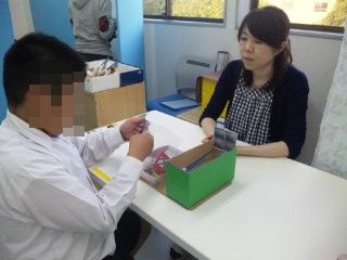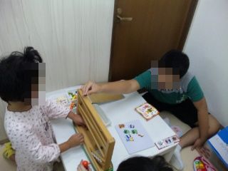 指示をみて、色のついた細いスティックを入れていく作業です。