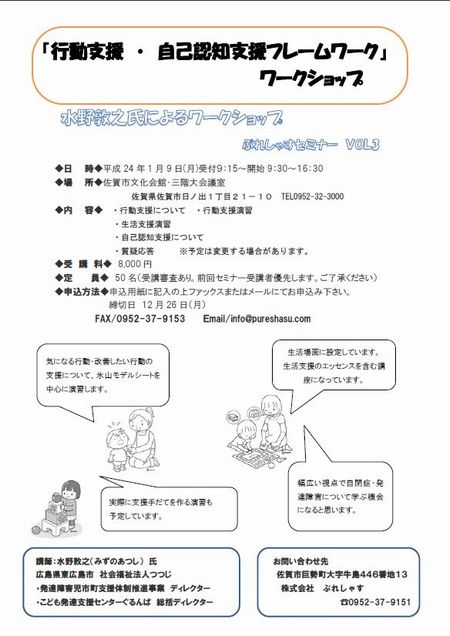 25日金曜日に記事を更新して さっそくのお申込みをいただきました。 ありがとうございます。 研修・セミナーのページにも記事をのせていますので ご覧ください。 3回連続セミナーの1,2を受講されていない方も 大丈夫です。 現場ですぐに役立つ内容になっています。 ぜひご参加ください。 第3回ぷれしゃすセミナー案内文 セミナーについては、 水野敦之先生のブログにも詳しく掲載されています。