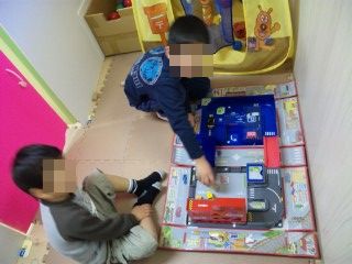 お友達と仲良く、ミニカーを走らせながら、パーキングに停めたり